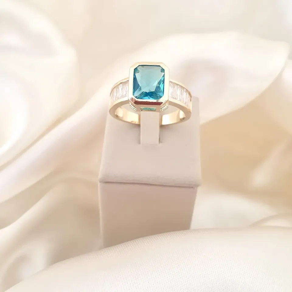 Anel Zircônia azul retangular 1cm