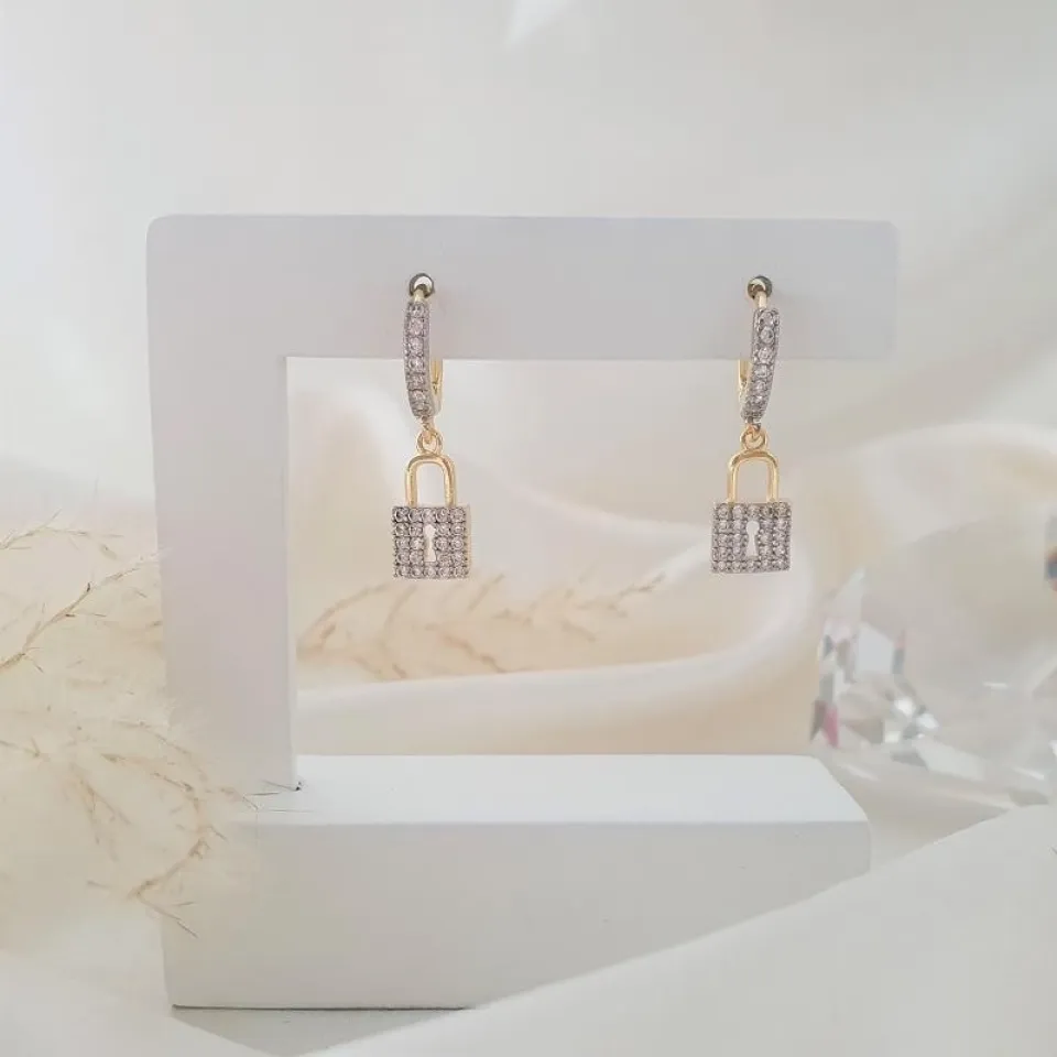 Brinco argola com pingente de cadeado cravejado