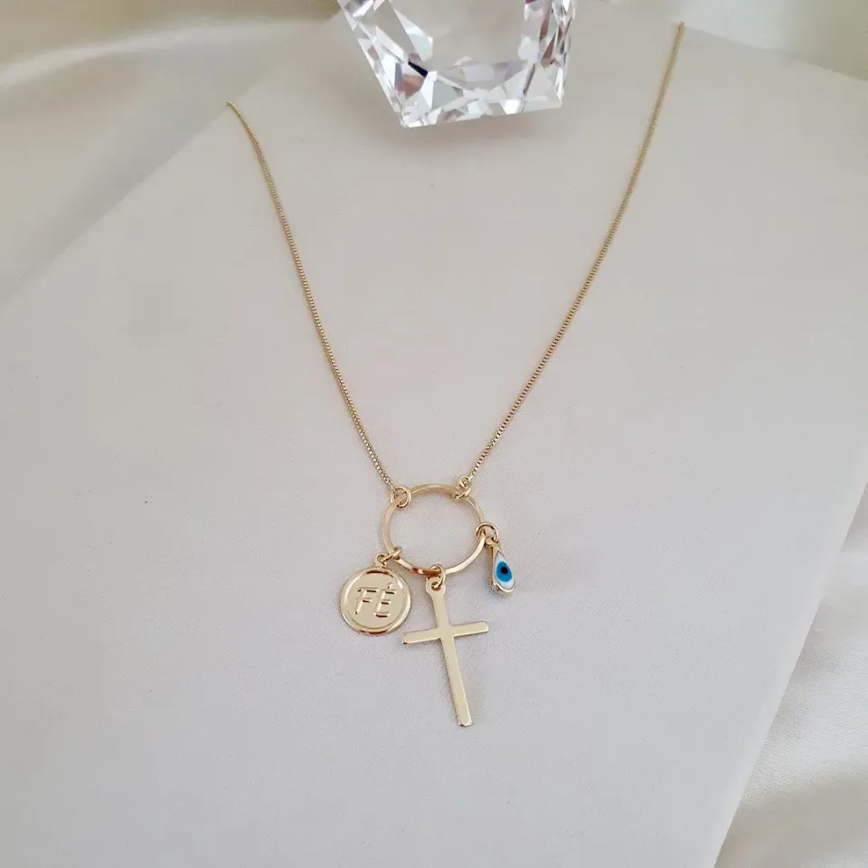 Colar com pingentes cruz, olho grego 70cm