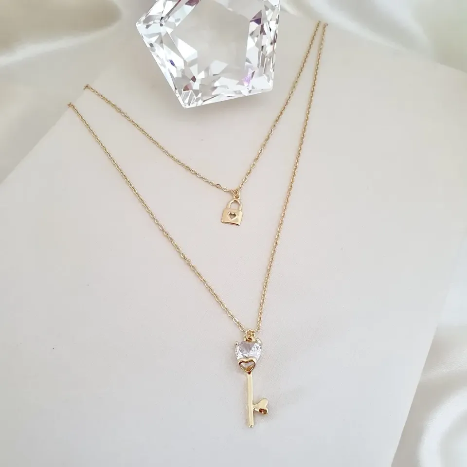 Colar duplo chave com zircônia e cadeado