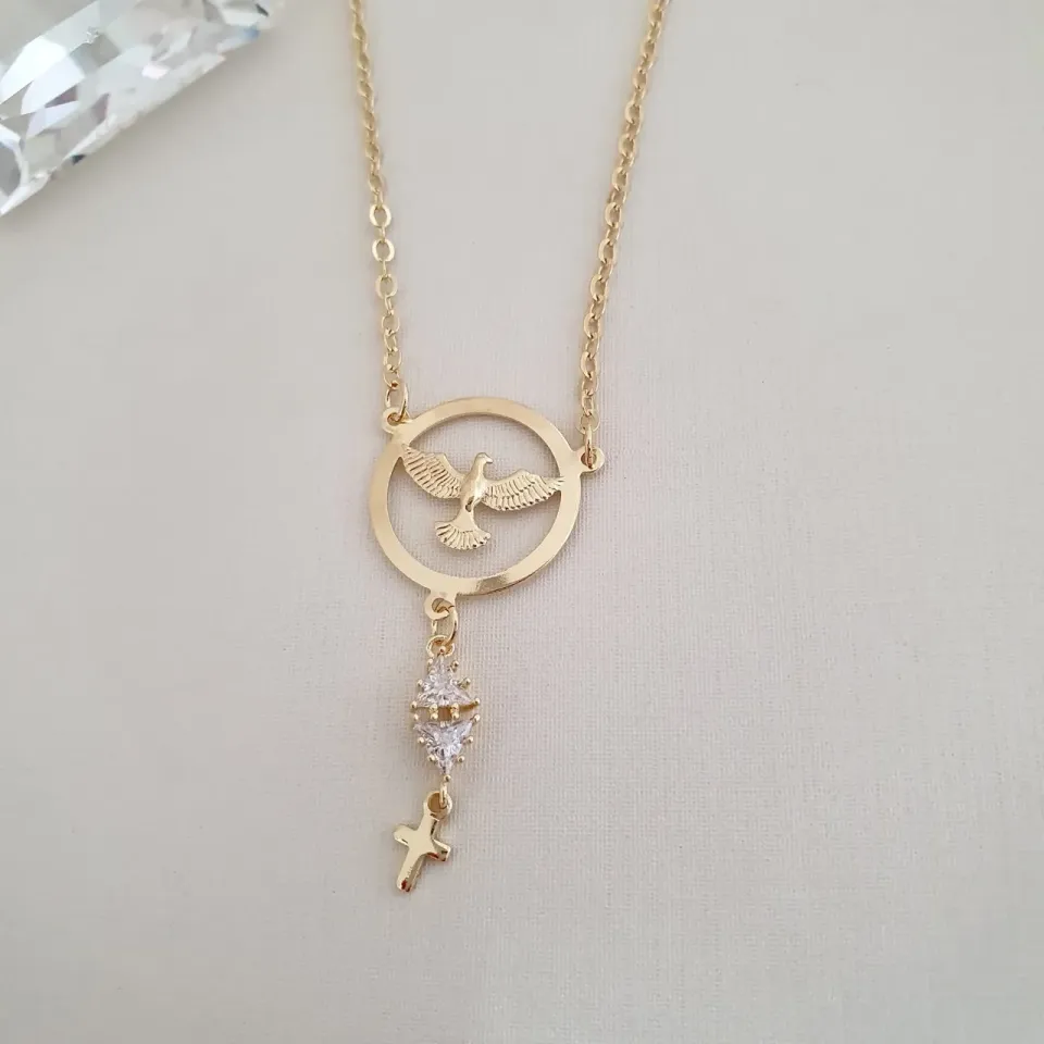 Colar Espirito Santo pingente zircônias e cruz