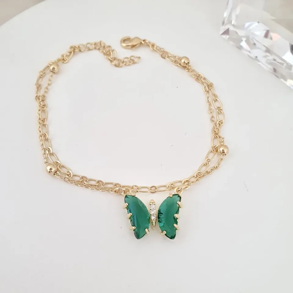 Pulseira dupla com borboleta de zircônia verde